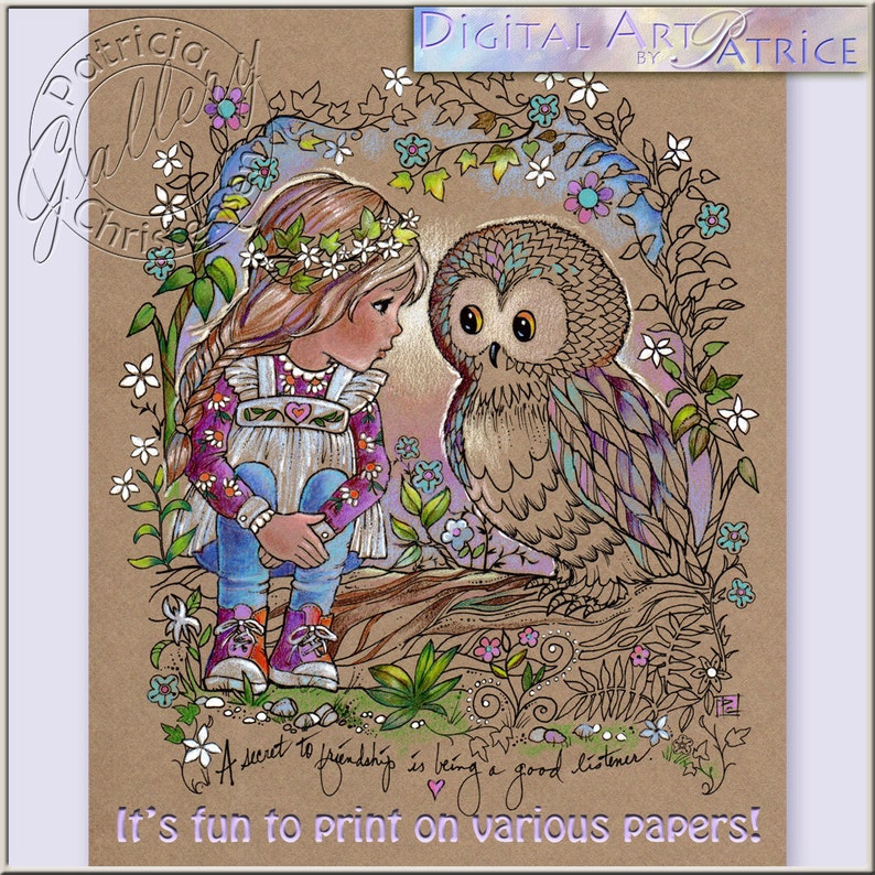 Printable Coloring Book Pages Digital Download Owl Girl Crafts And Cards Colored Pencils Gel Pens Print On Your Paper Of Choice