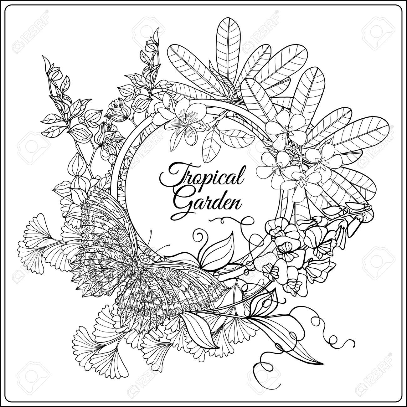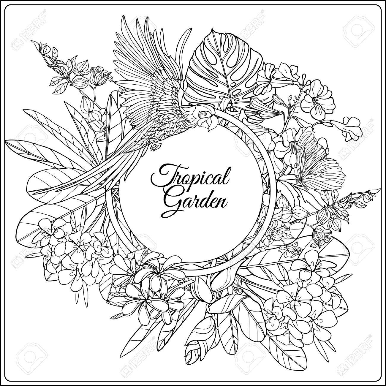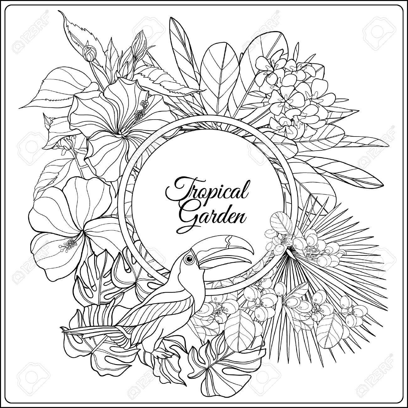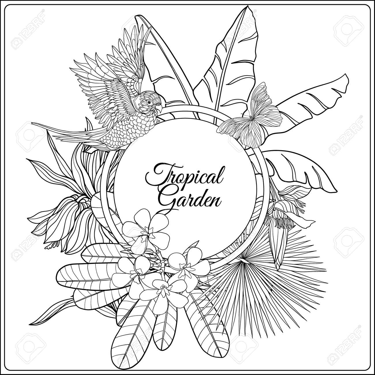 Animaux Et De Plantes Tropicales Composition Avec Espace Pour Le Texte Cette Illustration Peut Etre Utilise Ennemi Livre De Coloriage Adulte Vector